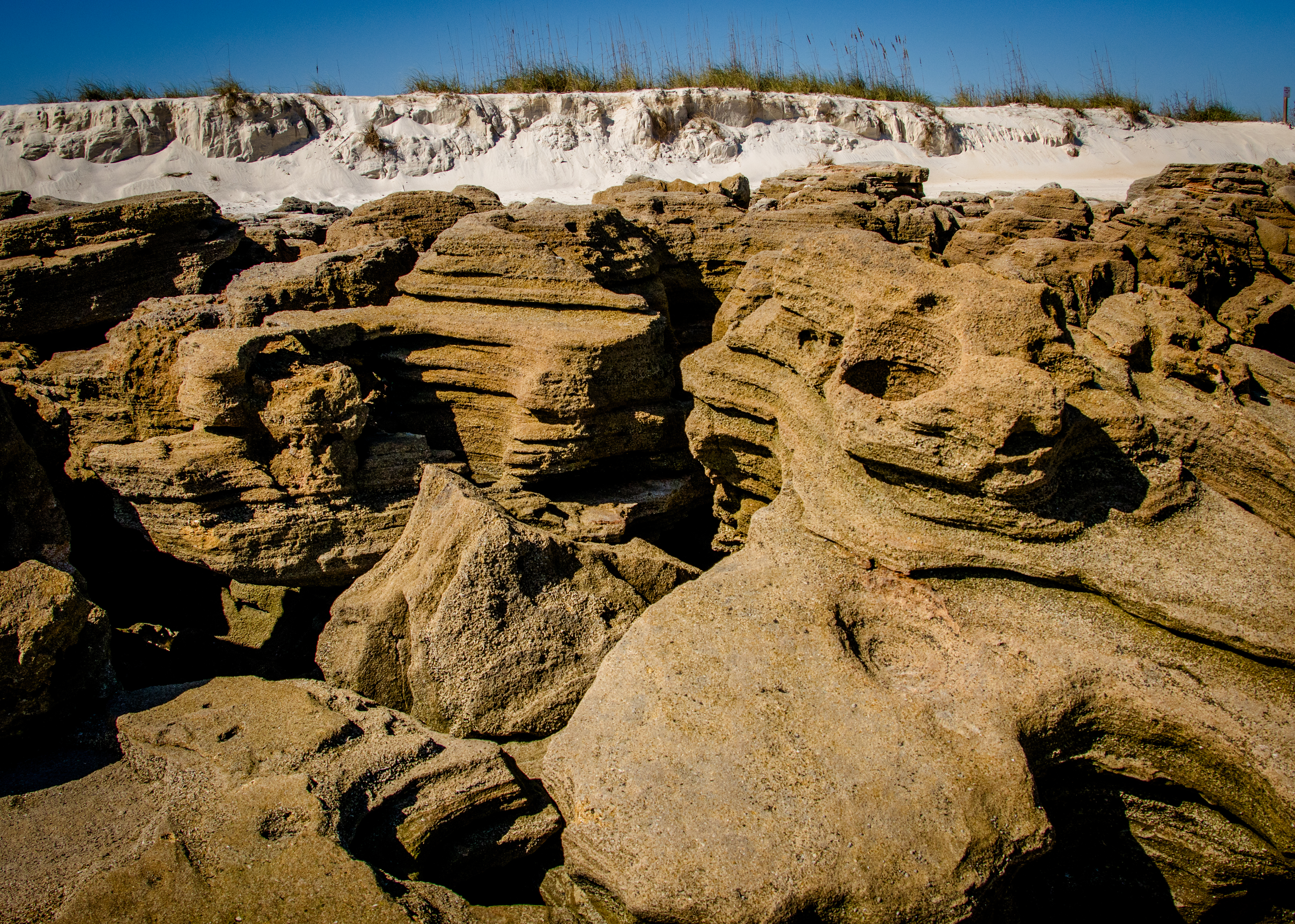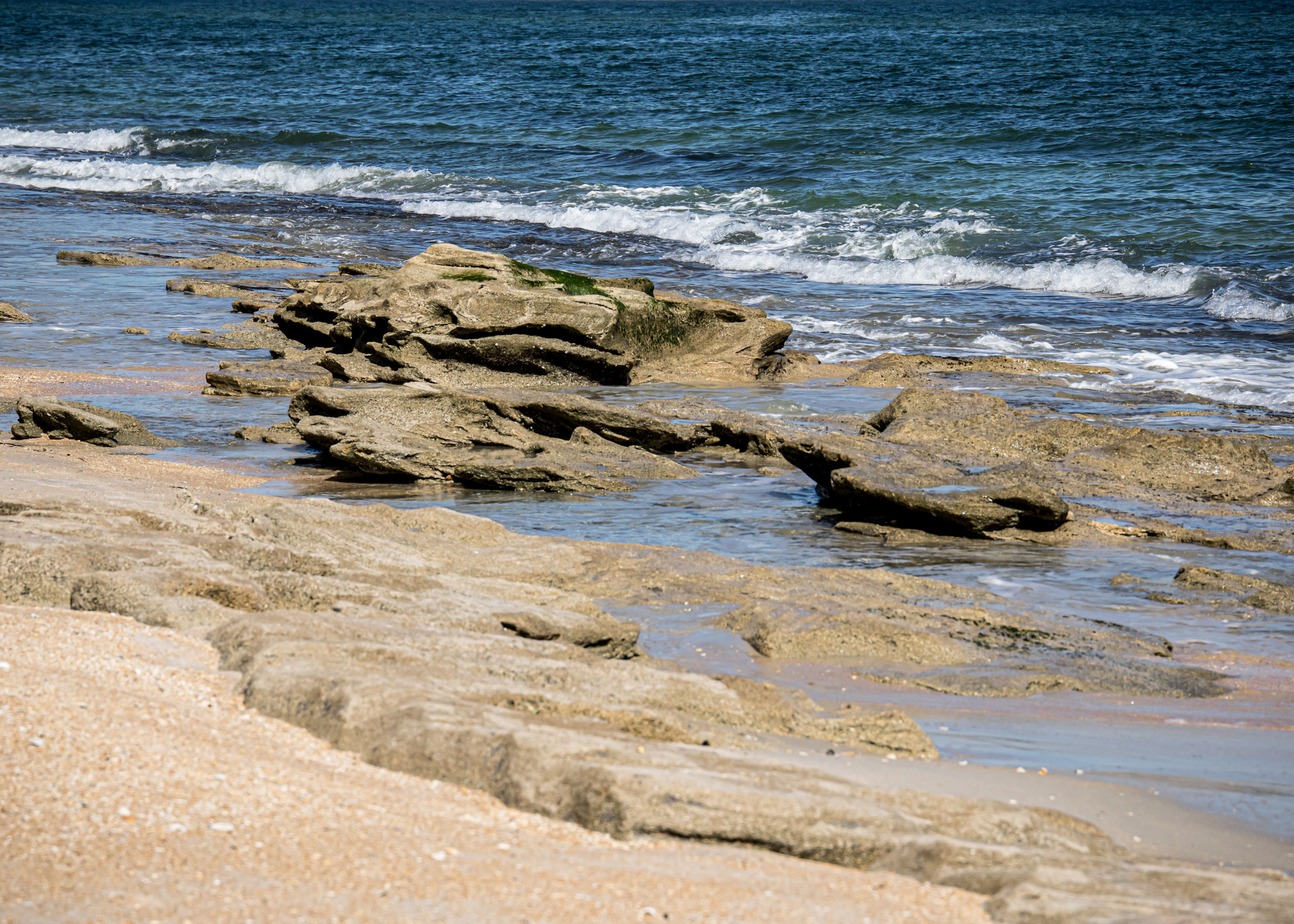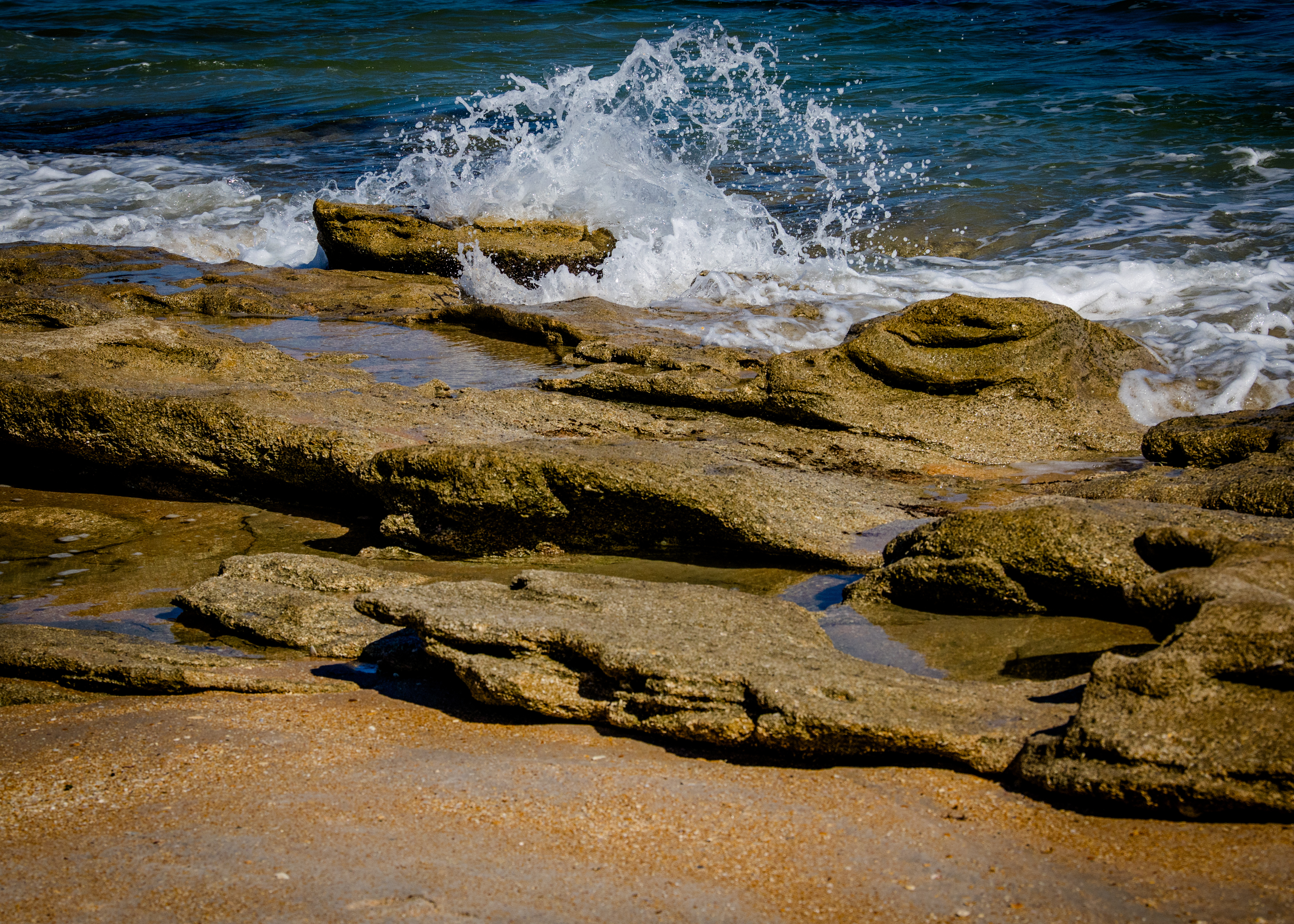 After spending time hiking in the River to Sea Preserve (Ocean to Matanzas River) near Marineland, I decided to revisit the Coquina Rocks along the ocean in Washington Oaks Gardens State Park. It had been at least three years since my last visit and shockingly the vista has significantly changed. As a result of the recent hurricanes and storms, the sand was washed away, and the rocks were at lease 50% more visible.