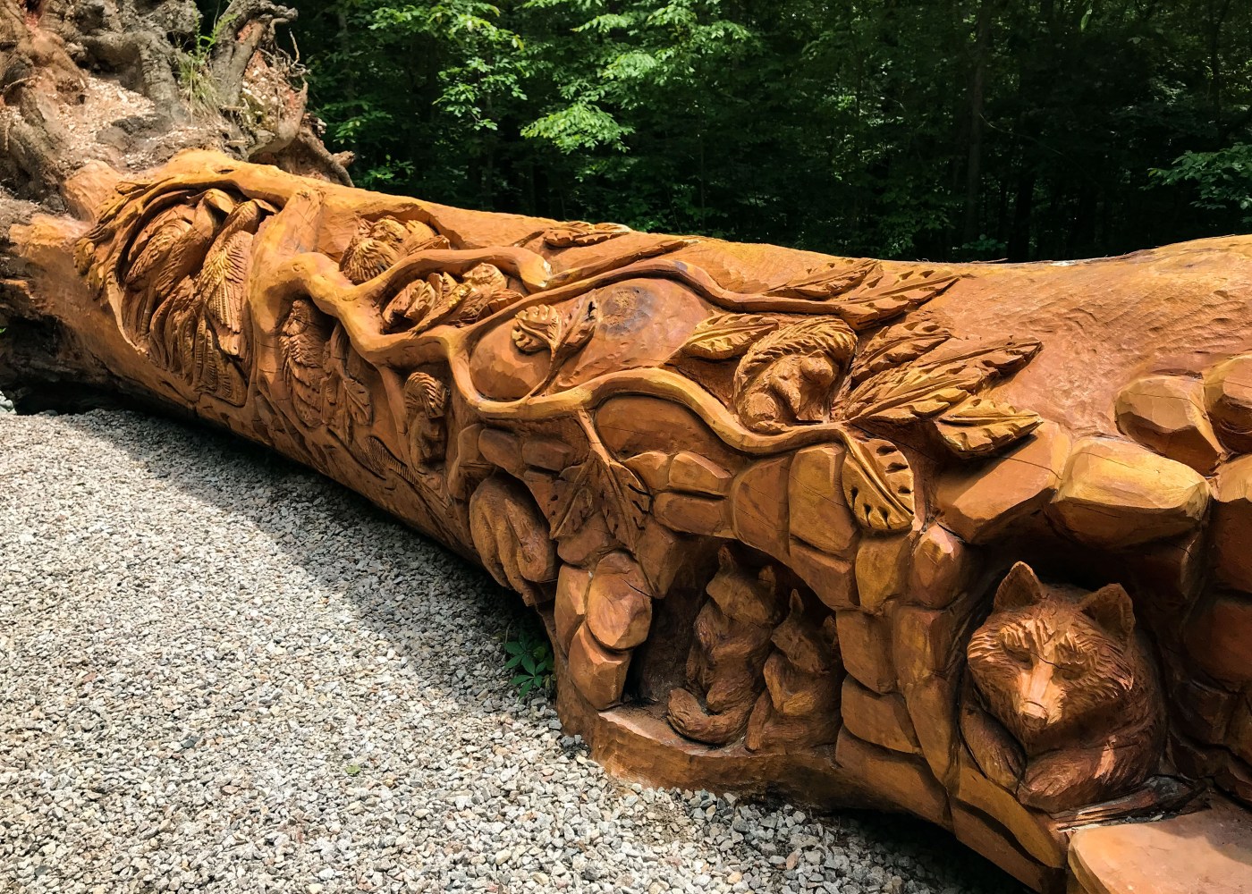 As an tune-up to Haley’s graduation trip to the Big Five we took an easy stroll through William B. Umstead State Park a North Carolina state park in Wake County, North Carolina. It covers 5,599 acres nestled between the expanding cities of Raleigh, Cary, and Durham, North Carolina. The park has 22 miles of well shaded hiking trails along with many miles of mixed use trails. Our goal was to reach a massive downed oak tree that has been chain saw carved by local artists Jerry Redi and Randy Boni. The art work features animals, tree branches and leaves.