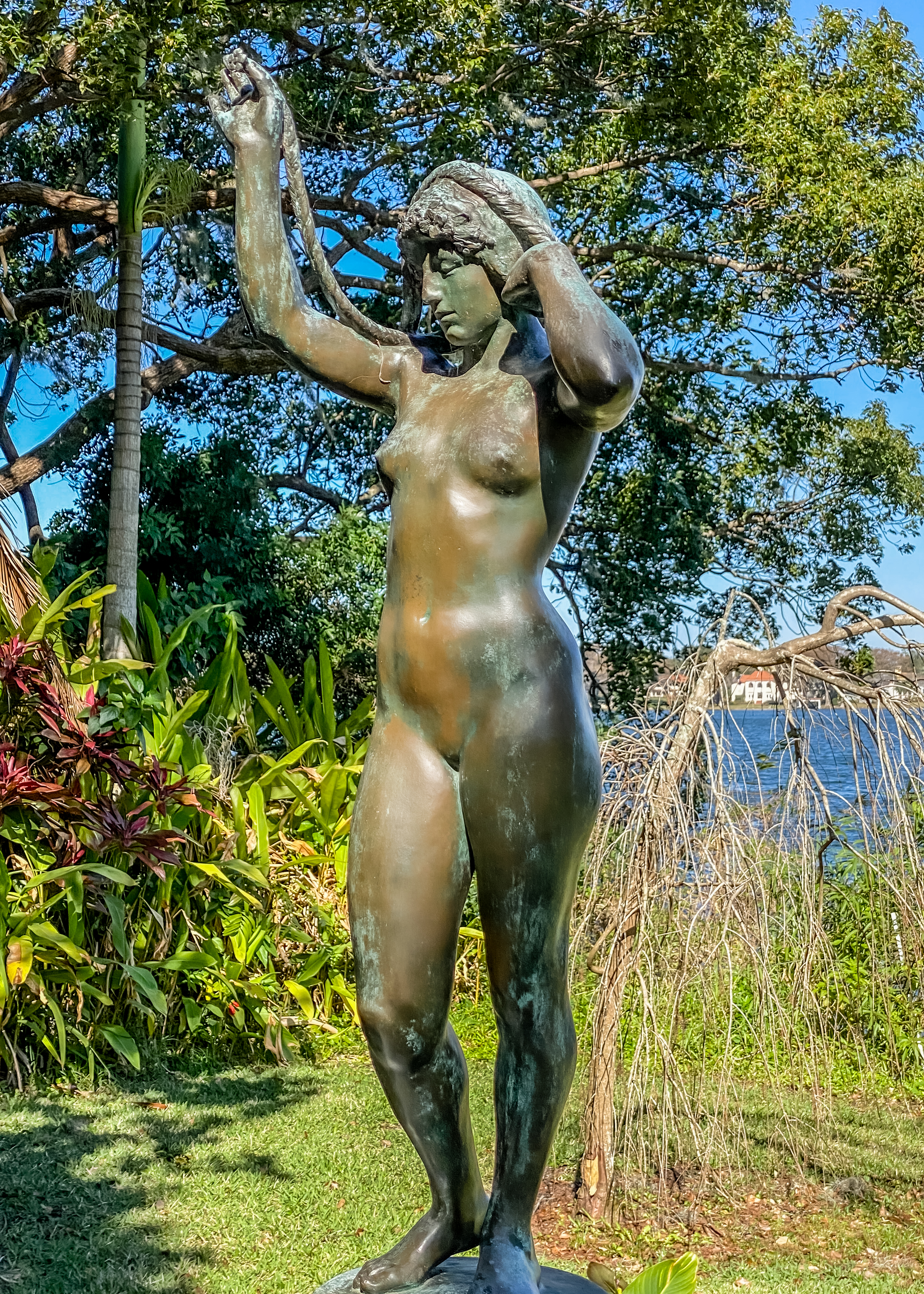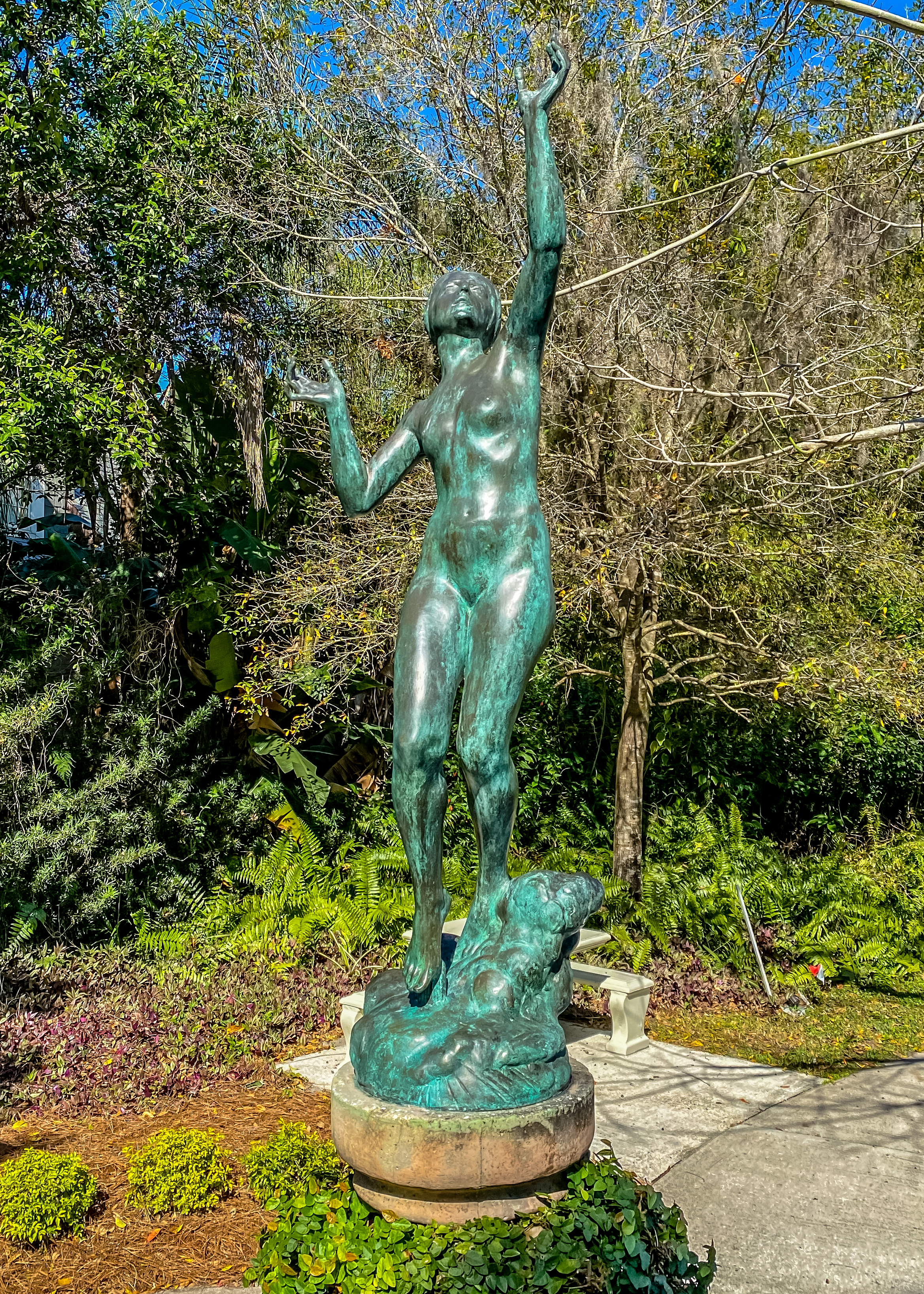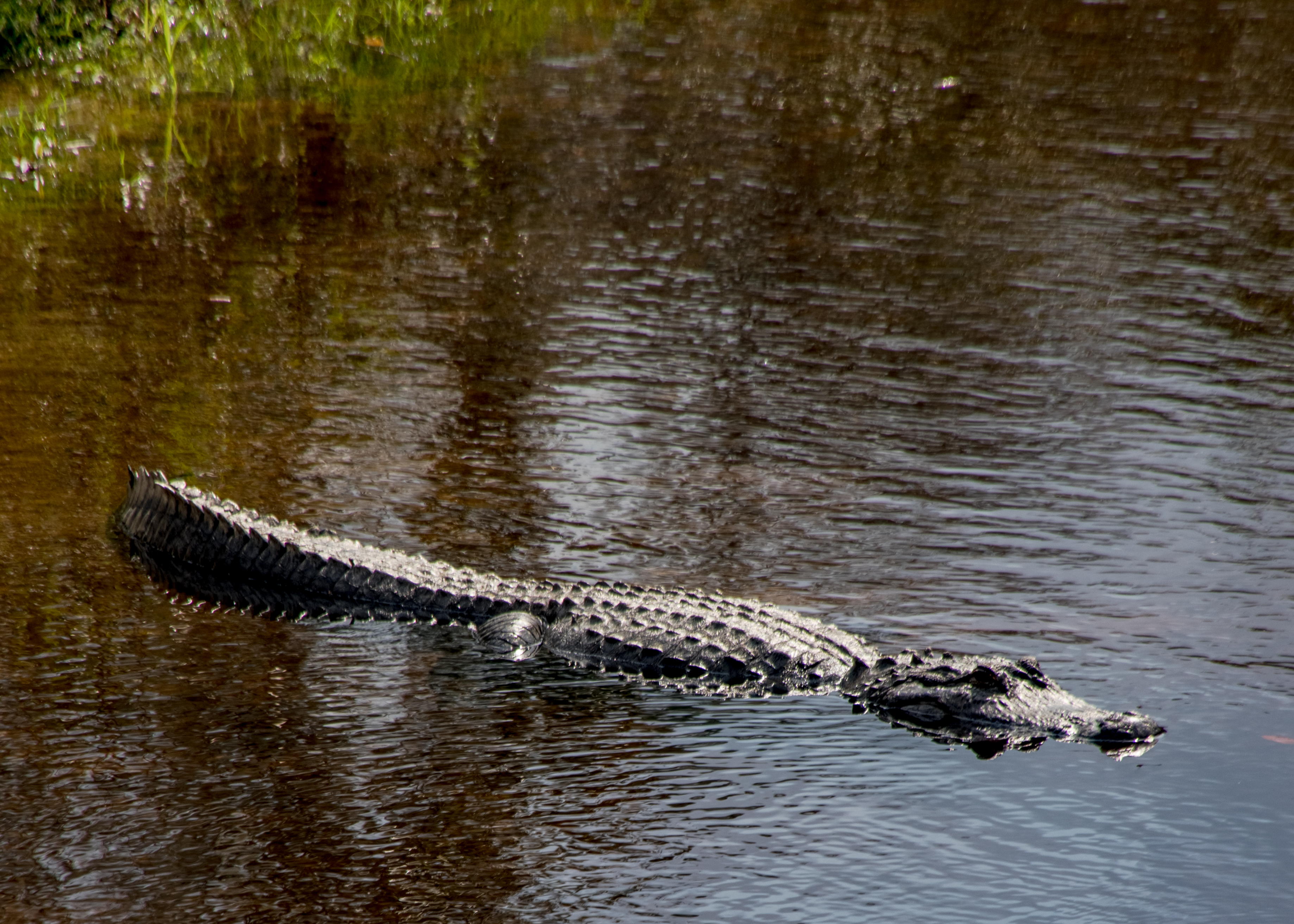 Along the way, we admired the many large oak and cypress trees and used one of several benches to watch the river. We’re told it’s a good place for birding and wildlife viewing, but our only sighting was an alligator. Where does the unusual name come from?