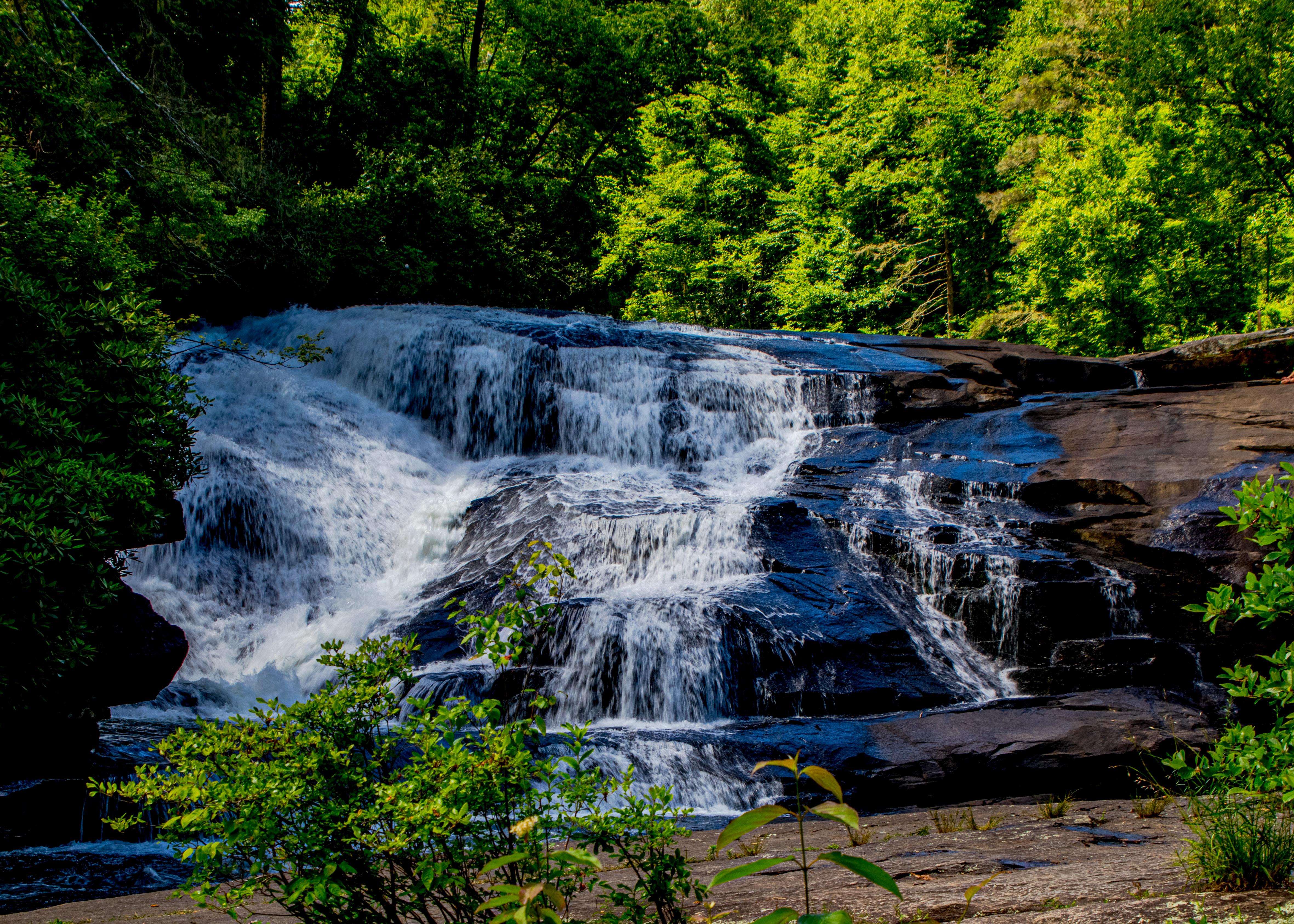 Silver Run Falls in the Nantahala National Forest is just four miles south of Cashiers in Jackson County. This 25-ft. waterfall cascades into a tranquil pool with a small beach area. It’s a short walk (about 1/4-mile) on a mostly level trail and across a bridge over the headwater of the Whitewater River. There are a couple of observation points along the shore to soak in the views of Silver Run Falls. And many rocks where you can step across to get a different angle.